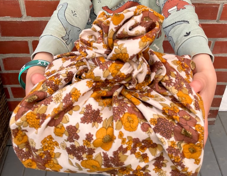 There are many choices to buy your Furoshiki, you could buy upcycled Furoshiki, you could purchase lovely designed Furoshiki from Japan, or you could purchase one of my favourites, Knot Again 100% organic cotton Furoshiki.